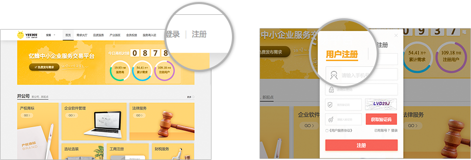 进入亿蜂平台首页,新用户点击“注册”,注册成功后,可在平台首页Banner图点击“免费发布需求”按钮,即可发布需求;