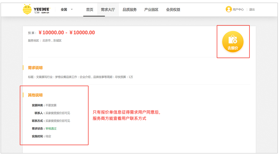 进入亿蜂平台首页,服务商登录后,可在“需求大厅”页面看到亿蜂平台根据服务商标签智能匹配的需求,服务商可点击“需求详情”按钮,获取需求详情,并在“需求详情”页面点击“去报价”按钮,完善报价单信息后,需求用户可查看到服务商信息并选择联系您。服务商报价单信息可在“用户中心”——“我的报价”中查看。